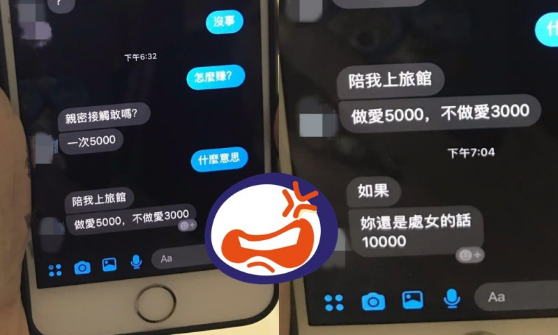 仔細看看截圖,只見男子先是問「還想賺錢嗎?」接着就開價「親密接觸敢嗎?一次5000(元)」,看到小女生懵懂回問「什麼意思?」男子便直說「陪我上旅館,做愛5000(元),不做愛3000(元)」,之後更補充「如果,妳還是處女的話,10000(元)」。