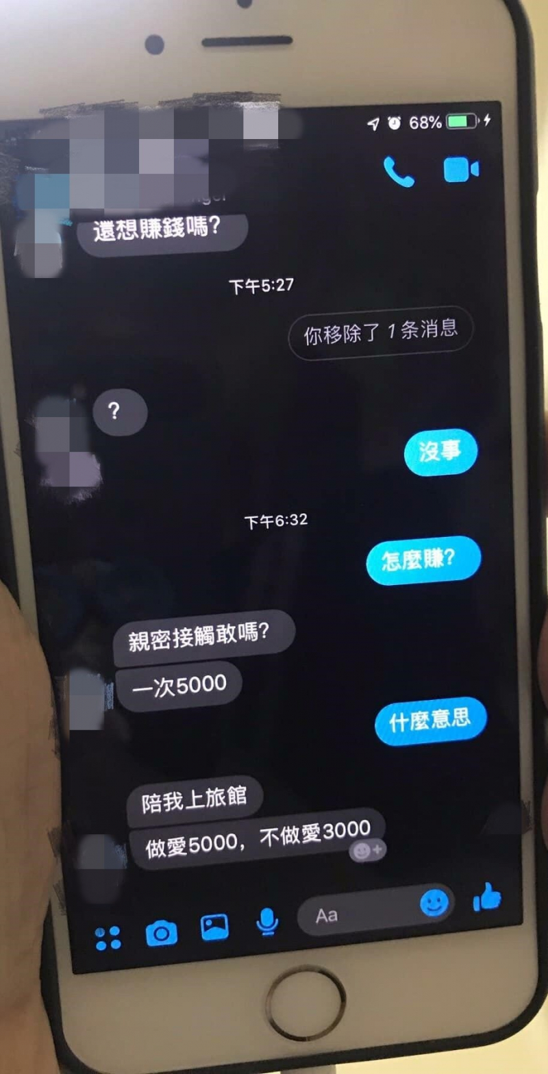 女網友在臉書《爆料公社》表示,朋友查女兒手機時,發現她在Messenger上被一名男子「開價」,詢問之下,才知道女兒的女同學因爲和該男出去聊天、賺到了錢,輾轉介紹男子來加女兒好友。