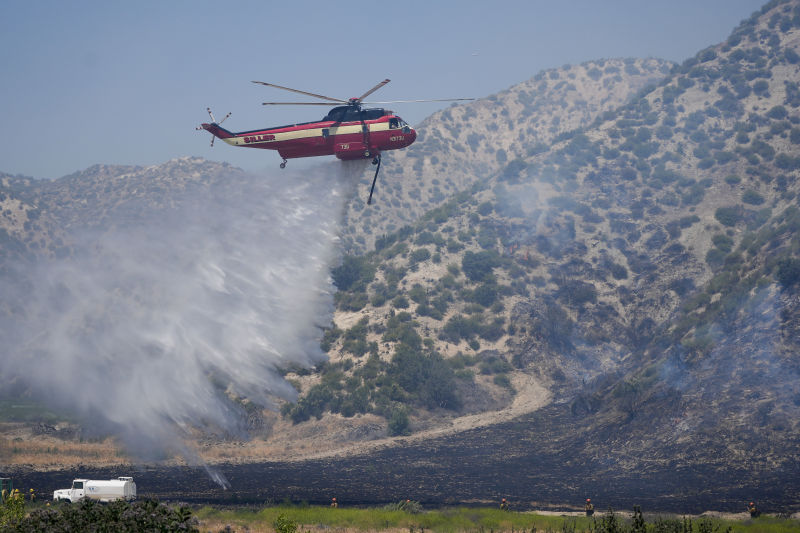 ▲美國加州戈爾曼地區週末發生大規模野火,燃燒電線杆冒火花,當局派滅火直升機。(圖/達志影像/美聯社,下同)