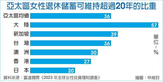 針對退休後支應生活所需,富達國際報告顯示,只有36%的亞太區女性認爲,其退休儲蓄能維持超過20年生活,其中,以大陸最樂觀,有57%受訪者預期退休儲蓄可維持超過20年生活,至於臺灣女性則有36%,香港只有27%、日本20%受訪者預期退休金可維持超過20年。