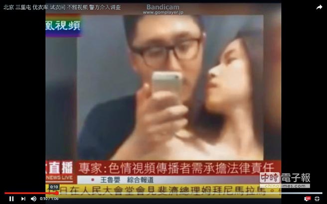 2015年7月,北京三里屯優衣庫試衣間不雅影片流出,並迅速轉發。(取自鳳凰視頻)
