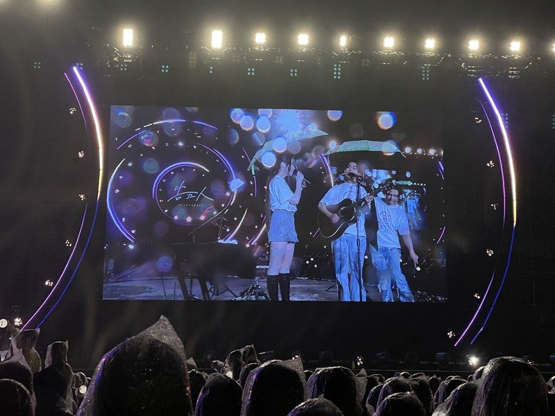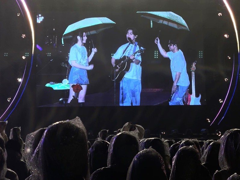 李小姐說,她聽了這麼多場演唱會,還是第一次穿拖鞋、搭配雨衣的奇特裝扮,乖坐在搖滾區,3名團員從頭到尾撐傘唱歌,也是超誇張的;演唱會剛開始小雨,當唱到「你所到之處(就下雨)」這首歌時,突然傾盆大雨嘩啦啦,全場歌迷爆笑。