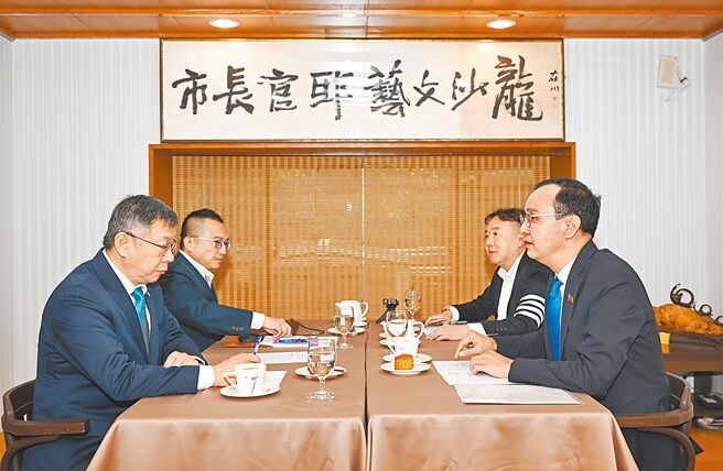 國民黨主席朱立倫(右)和民衆黨主席柯文哲(左)30日在臺北市長官邸藝文沙龍進行首次政黨協商。包括柯競辦主任周榆修(後左)、國民黨副秘書長江俊霆(後右)一同列席。(國民黨提供)