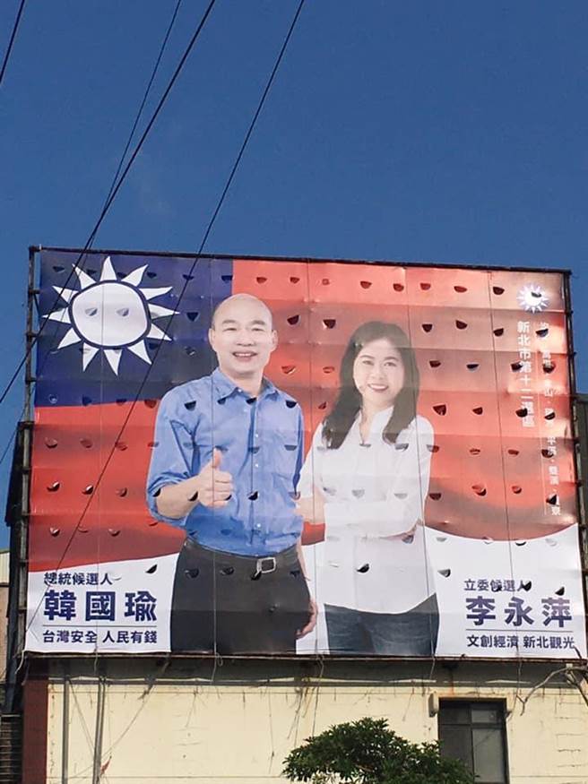 網友在臉書社團「韓家軍」發文,刊出自己在汐止看到的巨幅李永萍、韓國瑜聯合競選看板。偌大的看板,以中華民國國旗爲底色,左右兩側寫着代表李的「文創經濟 新北觀光」,與代表韓的「臺灣安全 人民有錢」。文章一出,獲得超過3000個贊、破200則留言與破40次分享。