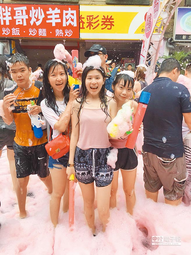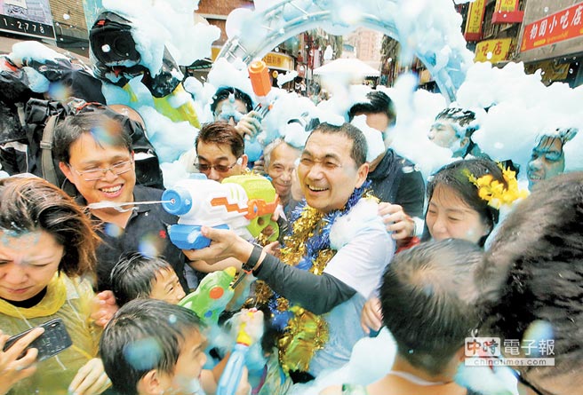 新北市長侯友宜(中)14日首度參加新北市潑水節,也拿着水槍下場與民衆同樂。(陳信翰攝)
